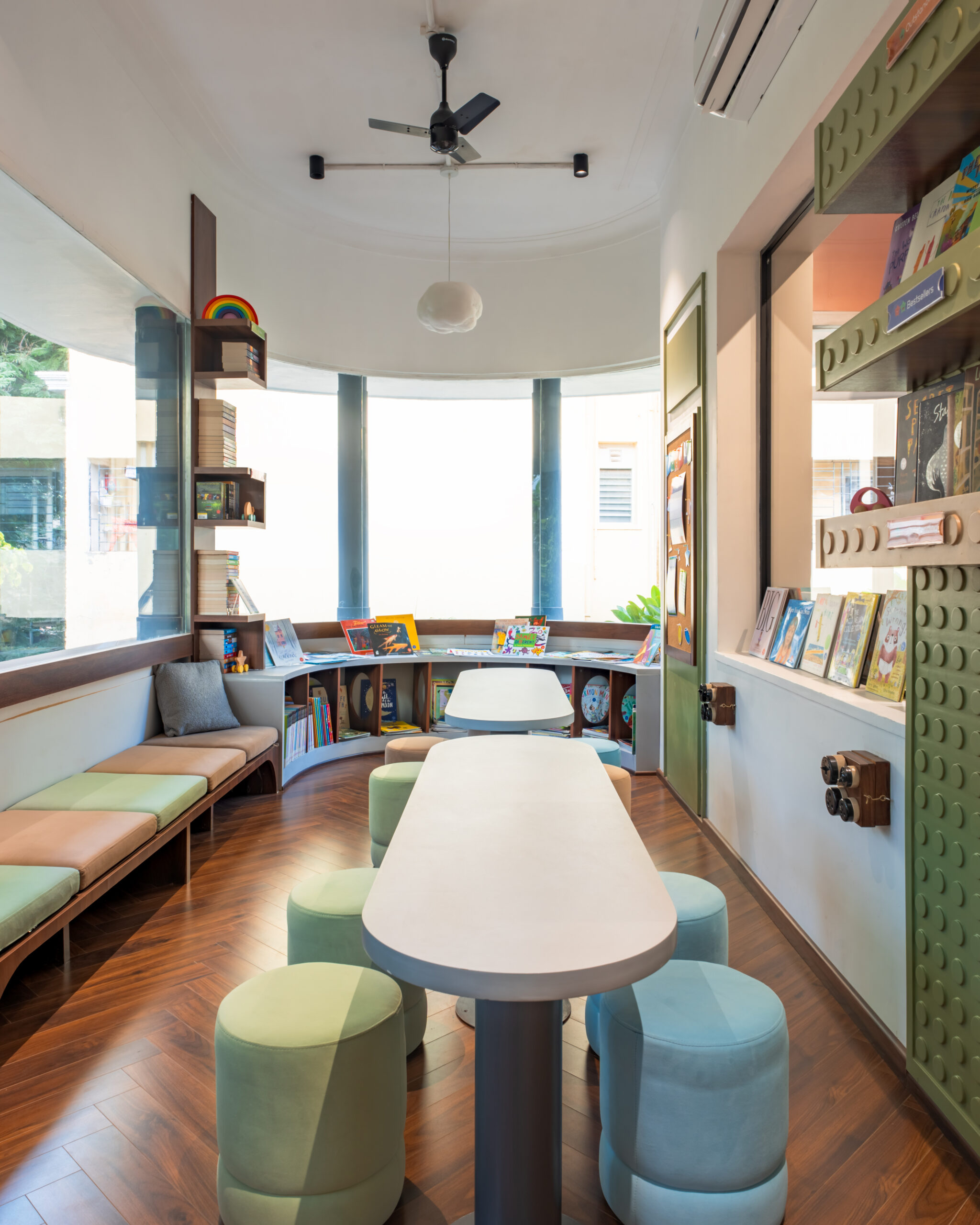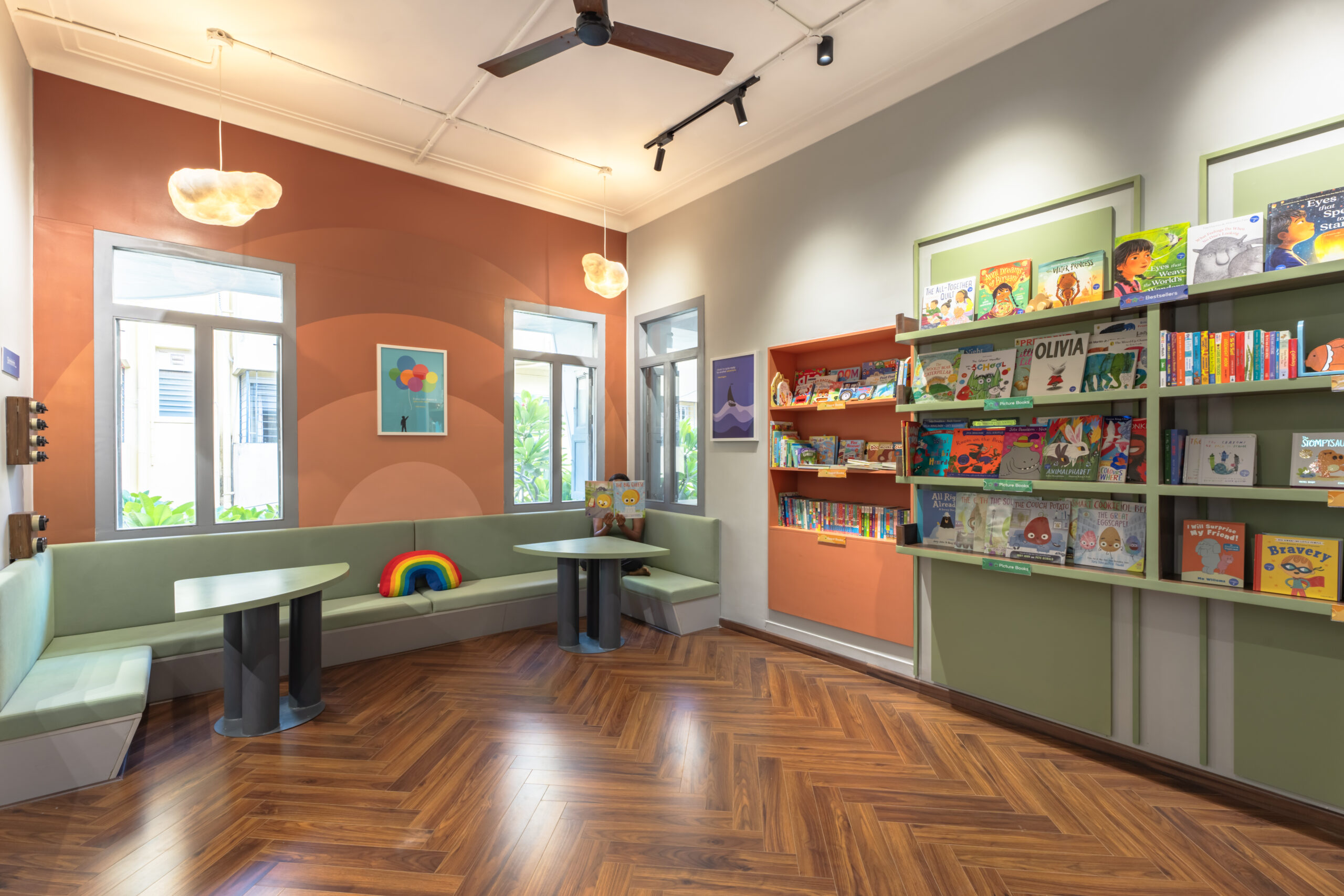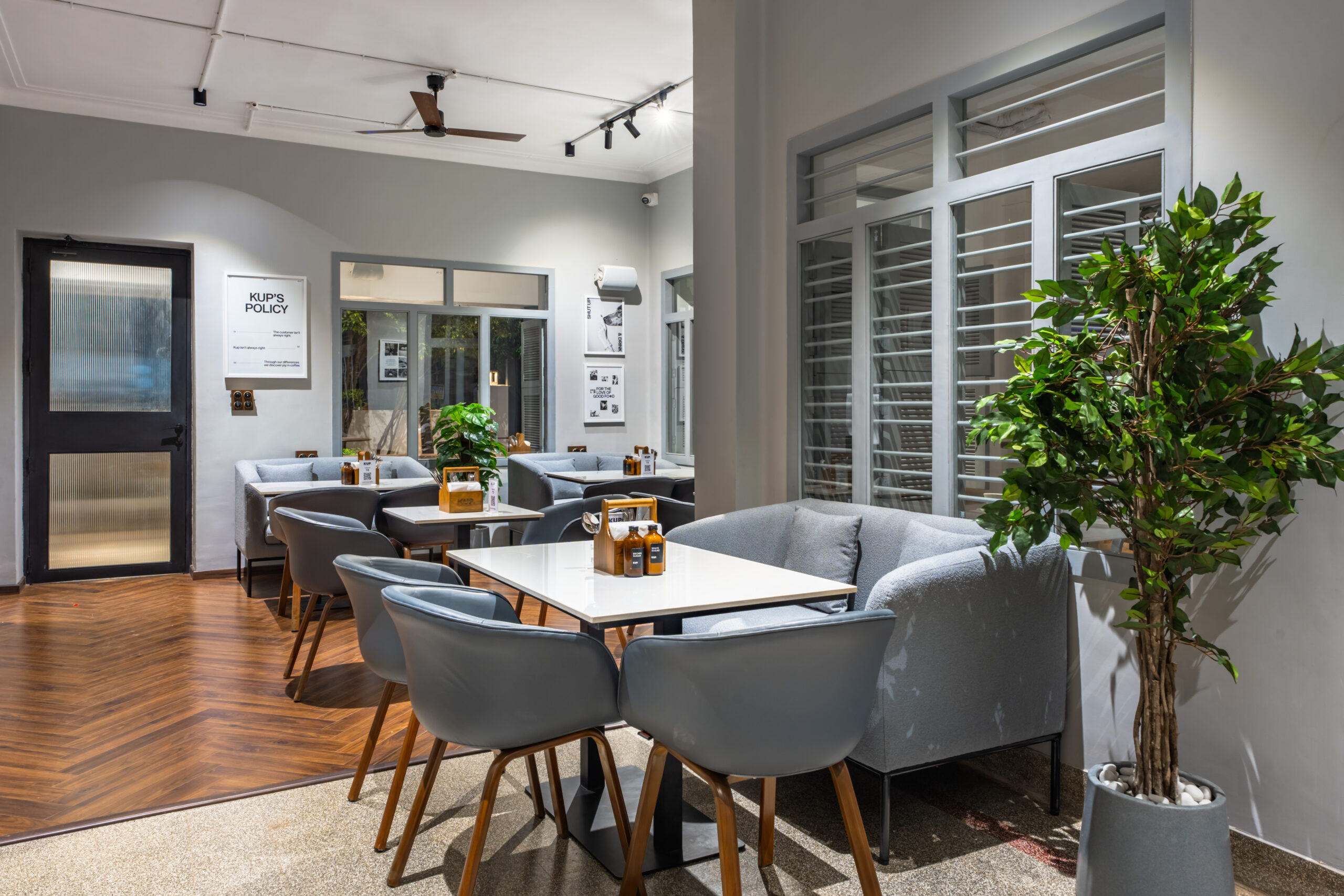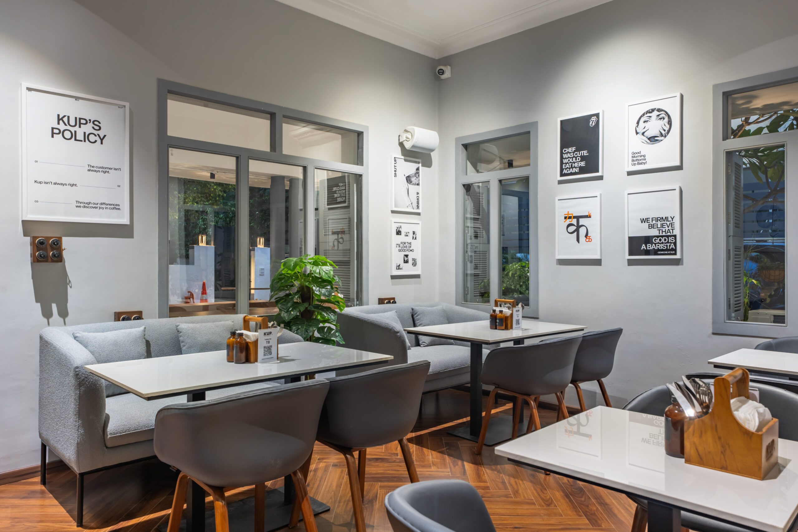 - Café-style indoor setting with cozy, modern seating